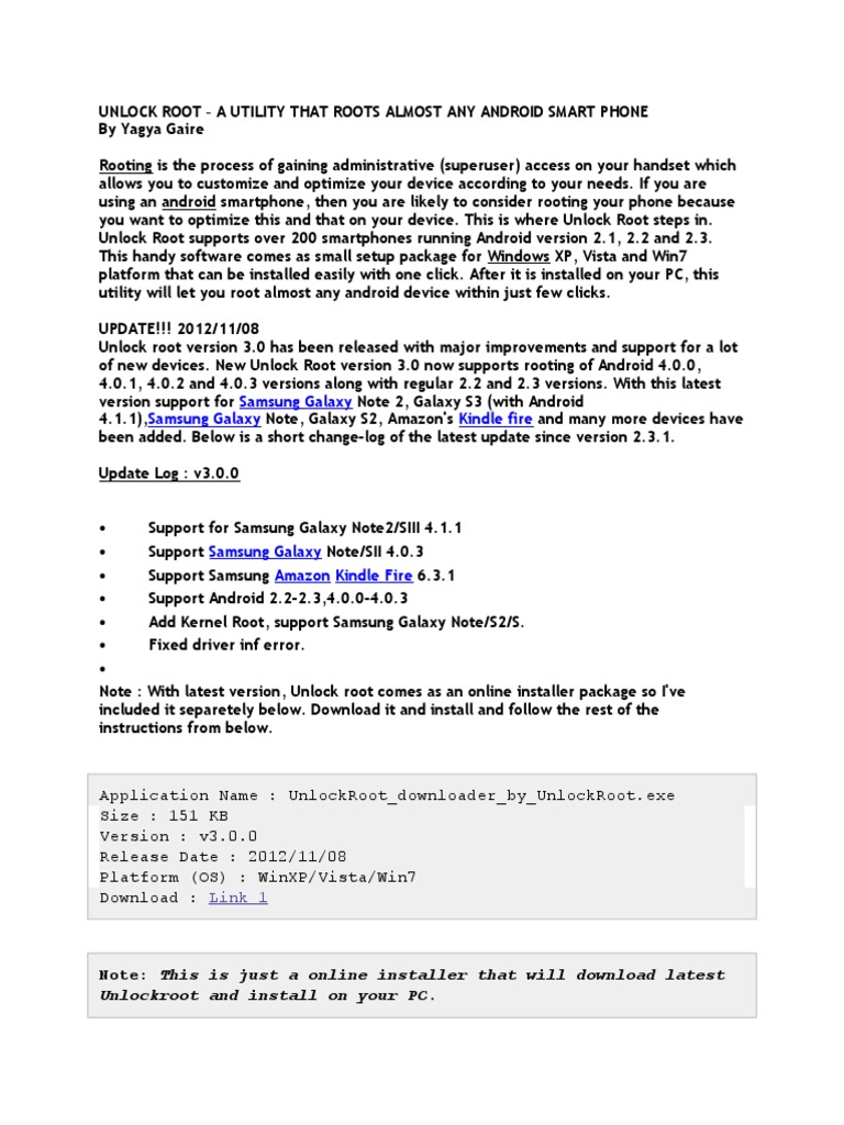 Support the android 2.1,2.2 and 2.3,easy way to get root access permissions. First, check whether your device is compatible with unlock root or not from here. Como todos sabes que al adquirir un dispositivo móvil viene con muchas personalizaciones de las compañas o fabricantes del mismo, . Unlockroot es una herramienta gratuita para windows, con la cual podremos rootear o desrootear un buen número de dispositivos compatibles, si quieres saber . Easy to use and download.